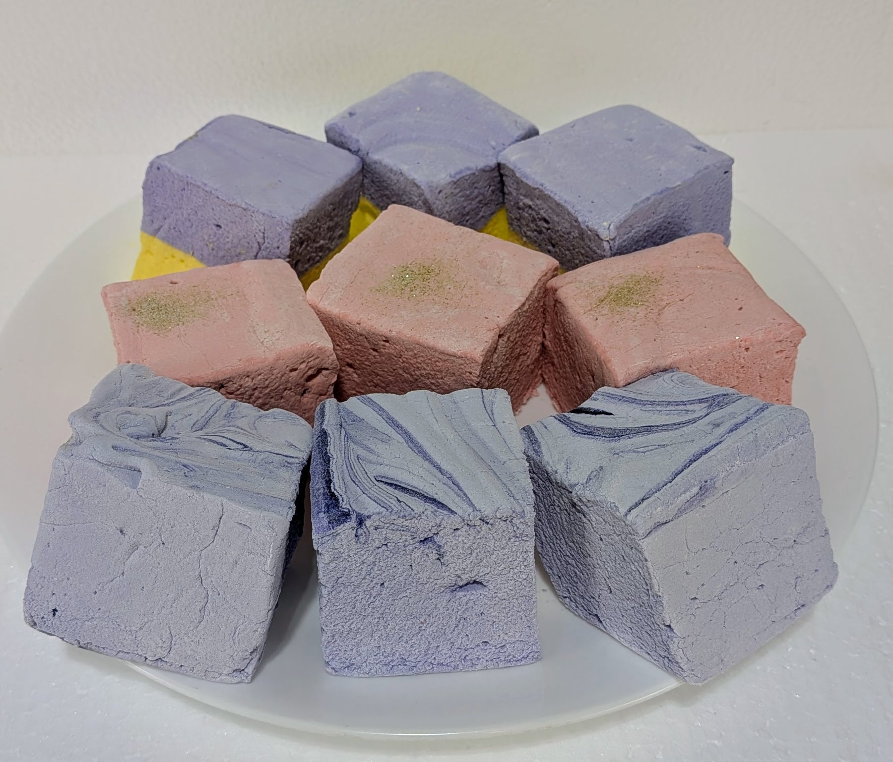 Colorful lBougie Marshmallow Bundle on a white plate champagne and sugar lavender and honey and creamy taro