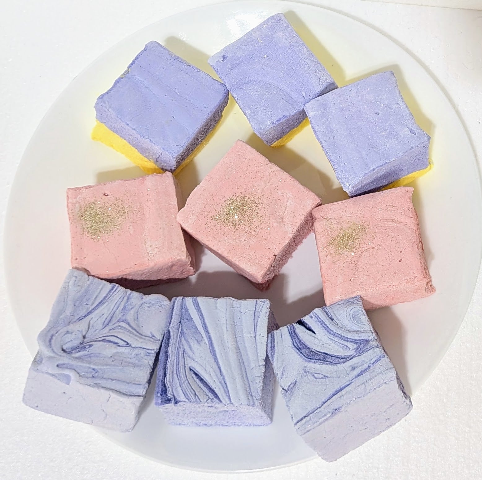 Colorful Bougie Marshmallow Bundle on a white plate featuring Champagne & Sugar, Lavender & Honey, and Creamy Taro flavors. Made with beef gelatin, organic marshmallow root, no corn syrup, and gluten-free ingredients.